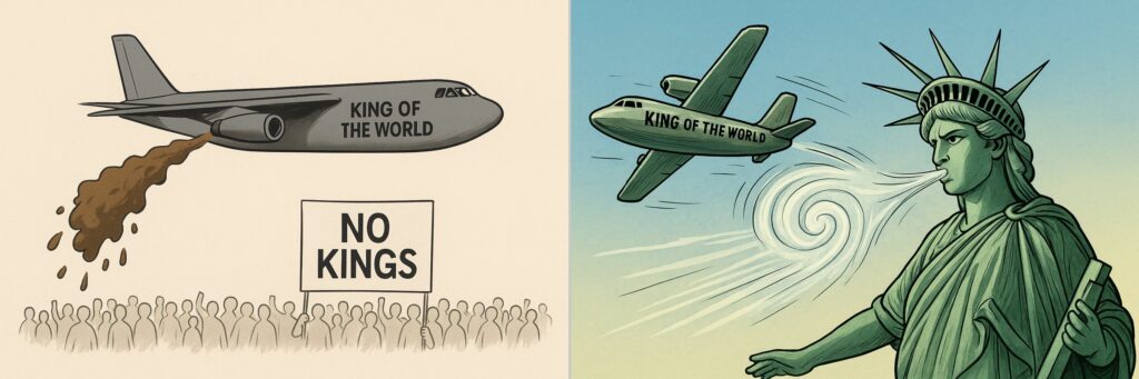 El pasado sábado, millones de personas salieron a las calles de Estados Unidos para protestar contra la deriva autocrática de la Administración Trump bajo el lema “No Kings”, en alusión a la imagen megalómana que el propio mandatario intenta proyectar. La respuesta del ocupante de la Casa Blanca fue difundir un vídeo generado con inteligencia artificial en el que aparece coronado como rey, pilotando un avión militar y bombardeando con mierda —literalmente— a los manifestantes. No se trata solo de una provocación obscena, sino de la escenificación de un poder bestializado que se complace en humillar, maltratar y violar el fundamento mismo de la democracia: la dignidad humana.