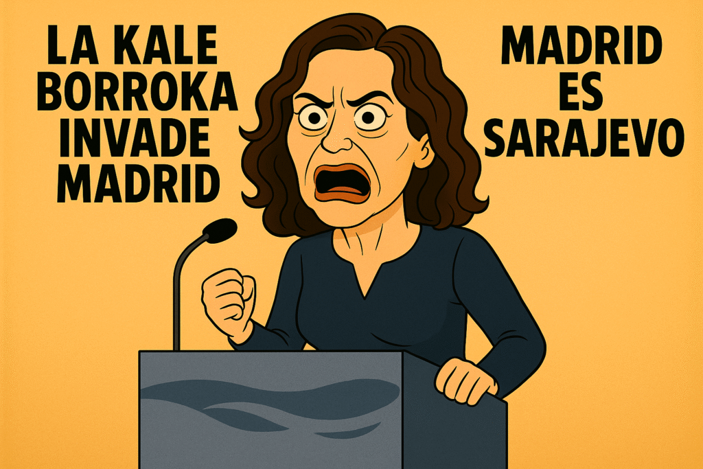 En este marco, el pasado lunes El Mundo abrió titulares con el bulo de que la Policía había identificado entre los manifestantes que interrumpieron la última etapa de la Vuelta ciclista a “nueve condenados por kale borroka” y a “varios yihadistas”. —Conviene recordar que kale borroka significa simplemente “lucha callejera”, pero dicho en euskera suena a terrorismo, que es lo que se busca—. Aunque el bulo fue desmentido de inmediato por la propia Policía, sirvió de munición para la ultraderecha. La presidenta madrileña, Isabel Díaz Ayuso, en su papel de agitadora mayor del PP, lo aprovechó para asociar las protestas con una kale borroka alentada por Sánchez y comparar Madrid con un “Sarajevo en guerra” donde «se persigue a los judíos». ¿No es esta ficción hiperbólica violencia política?
