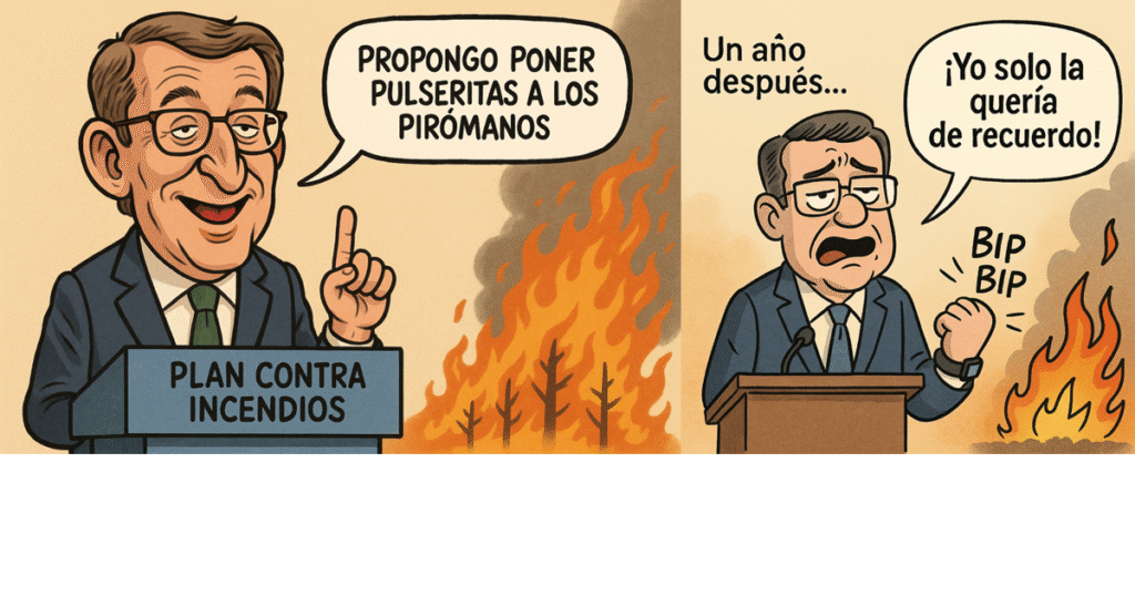 La magnitud de los incendios forestales que han arrasado miles de hectáreas y puesto en jaque a pueblos enteros en este país ha vuelto a dejar en evidencia la incapacidad del PP para afrontar las grandes catástrofes. Por si aún quedaba alguna duda, el propio PP, a través de su jefe de filas, Feijóo, se ha encargado de confirmarlo: según Feijóo, el problema son los pirómanos y la solución mágica pasa por ficharlos en un registro y colocarles pulseras de geolocalización. En fin, cualquier cosa —incluso lo más ridículo— con tal de desviar la atención de la nefasta gestión de sus presidentes autonómicos y evitar entrar en el meollo de la cuestión: la necesidad de destinar recursos públicos a la prevención de incendios, con servicios públicos reforzados, programas de reforestación, apoyo a la ganadería extensiva, políticas de repoblación rural y condiciones de trabajo dignas para quienes están en primera línea del fuego, los bomberos forestales.